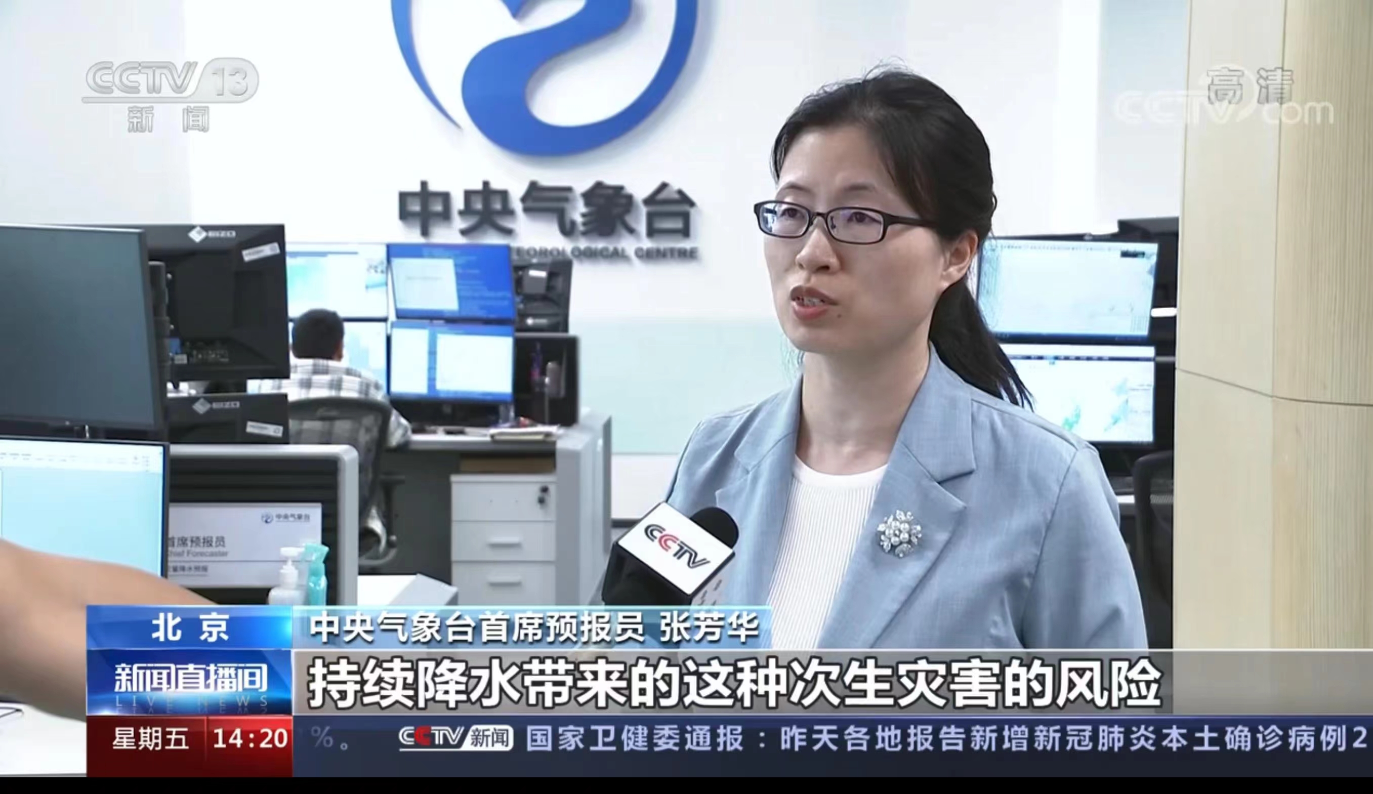 图为张芳华接受媒体采访,解析天气过程可能带来的影响。中央气象台 供图